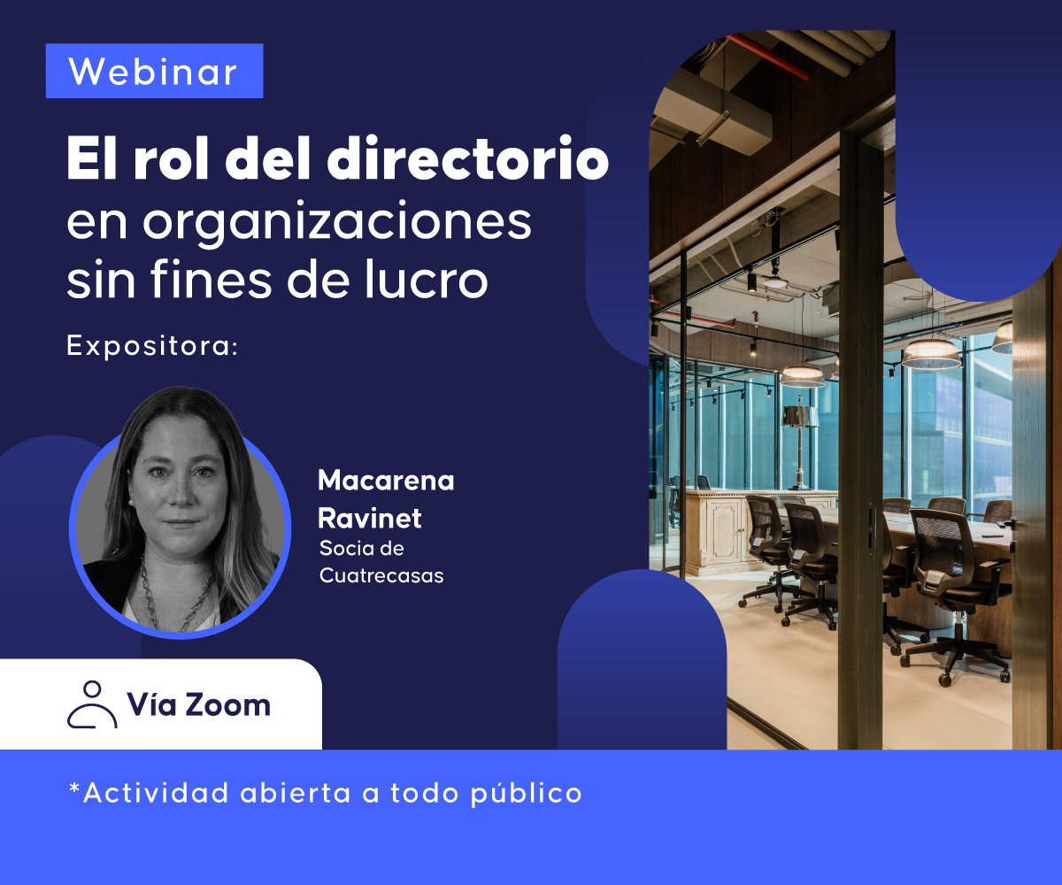En un escenario donde las organizaciones sin fines de lucro enfrentan crecientes expectativas de transparencia, impacto social y sostenibilidad institucional, el Instituto de Directores de Chile invita a la Red Alumni IdDC a una conversación con Macarena Ravinet, destacada abogada y socia de Cuatrecasas, con amplia trayectoria en gobierno corporativo, fusiones y adquisiciones, reestructuraciones y asesoría a fundaciones y organizaciones sin ánimo de lucro. Ravinet es además presidenta y directora de Fundación Pro Bono Chile, y cuenta con amplia experiencia en asesorar a organizaciones de la sociedad civil en materias corporativas, financieras y de responsabilidad social.